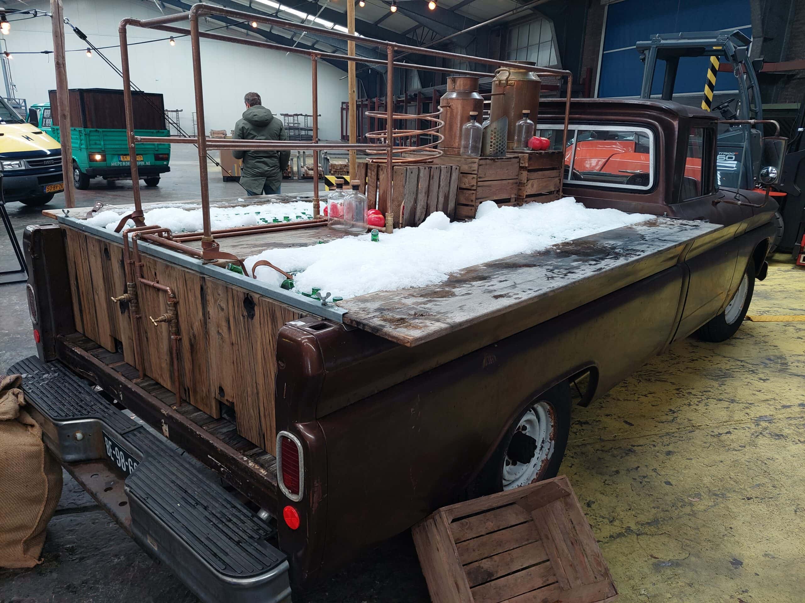Met zijn stoere uitstraling is onze Chevy niet te missen. Door zijn handige constructie, waarbij de houten platen verschoven kunnen worden, is hij gemakkelijk in te zetten als ijsbar. De volledige laadbak kan zo gevuld worden, waardoor je gehele dag kunt genieten van de koudste drankjes.